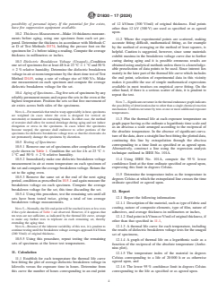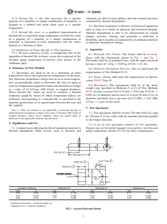 SIGNIFICANCE AND USE 5.1 A major factor affecting the life of insulating materials is thermal degradation. Other factors, such as moisture and vibration, are able to cause failures after the material has been weakened by thermal degradation. 5.2 Electrical insulation is effective in electrical equipment only as long as it retains its physical and electrical integrity. Thermal degradation is able to be characterized by weight change, porosity, crazing, and generally a reduction in flexibility, and is usually accompanied by an ultimate reduction in dielectric breakdown voltage. SCOPE 1.1 This test method provides a procedure for evaluating thermal endurance of flexible sheet materials by determining dielectric breakdown voltage at room temperature after aging in air at selected elevated temperatures. Thermal endurance is expressed in terms of a temperature index. 1.2 This test method is applicable to such solid electrical insulating materials as coated fabrics, dielectric films, composite laminates, and other materials where retention of flexibility after heat aging is of major importance (see Note 4). 1.3 This test method is not intended for the evaluation of rigid laminate materials nor for the determination of thermal endurance of those materials which are not expected or required to retain flexibility in actual service. 1.4 The values stated in acceptable metric units are to be regarded as the standard. The values in parentheses are for information only. 1.5 This standard does not purport to address all of the safety concerns, if any, associated with its use. It is the responsibility of the user of this standard to establish appropriate safety, health, and environmental practices and determine the applicability of regulatory limitations prior to use. For a specific hazard statement, see 10.1. 1.6 This international standard was developed in accordance with internationally recognized principles on standardization established in the Decision on Principles for the Development of International Standards, Guides and Recommendations issued by the World Trade Organization Technical Barriers to Trade (TBT) Committee.