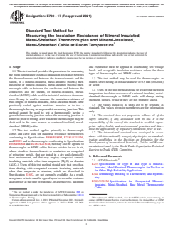 SIGNIFICANCE AND USE 5.1 Thermocouples fabricated from thermocouple cable that has been contaminated by moisture or by other impurities may undergo large changes in thermoelectric properties or may fail catastrophically when exposed to high temperatures. Since such contamination usually lowers the electrical resistance between the thermoelements and the sheath substantially, measurement of the insulation resistance can provide a valuable check of insulation quality and cleanliness, and can serve as a basis for rejection of unsuitable material and unreliable components. For manufacturers in particular, low electrical insulation resistance can also be indicative of displaced thermoelements or conductors or defects in the metal sheath which will require further investigation, but all users should be aware of these potential defects when faced with an unacceptable insulation resistance measurement. 5.2 This test method is primarily intended for use by manufacturers and users of mineral-insulated, metal-sheathed (MIMS) thermocouples or MIMS cables to verify that measured values of insulation resistance exceed specified minimum values, such as those listed in Specifications E235, E585/E585M, E608/E608M, E2181/E2181M, and E2821. Manufacturers and users should be aware, however, that when the insulation resistance is greater than 1 × 108 Ω, disagreement by an order of magnitude in the results obtained with this test method is not unusual. In addition, users of this test method should appreciate that the room temperature insulation resistance of both MIMS cables and of finished thermocouples will change during shipment, storage, and use if the end seals are damaged or defective. Consequently, values of insulation resistance determined by this test method may not necessarily be repeatable. SCOPE 1.1 This test method provides the procedures for measuring the room temperature electrical insulation resistance between the thermoelements and between the thermoelements and the sheath, of a mineral-insulated, metal-sheathed (MIMS) thermocouple or mineral-insulated, metal-sheathed (MIMS) thermocouple cable or between the conductors and between the conductors and the sheath, of mineral-insulated, metal-sheathed (MIMS) cable used for industrial resistance thermometers. It may be used to measure the insulation resistance of bulk lengths of mineral-insulated, metal-sheathed MIMS cable previously sealed against moisture intrusion or to test a thermocouple having an ungrounded measuring junction. This method cannot be used to test a thermocouple having a grounded measuring junction unless the measuring junction is removed prior to testing, after which the thermocouple may be dealt with in the same manner as a mineral-insulated, metal-sheathed (MIMS) cable. 1.2 This test method applies primarily to thermocouple cables and cable used for industrial resistance thermometers conforming to Specifications E585/E585M, E2181/E2181M, and E2821 and to thermocouples conforming to Specifications E608/E608M and E2181/E2181M, but may also be applied to thermocouples or MIMS cables that are suitable for use in air, whose sheath or thermoelements or conductors are comprised of refractory metals, that are tested in a dry and chemically inert environment, and that may employ compacted ceramic insulating materials other than magnesia (MgO) or alumina (Al2O3). Users of this test method should note that specifications dealing with compacted ceramic insulating materials other than magnesia or alumina, which are described in Specification E1652, are not currently available. As a result, acceptance criteria must be agreed upon between the customer and supplier at the time of purchase, or alternatively, judgment and experience must be applied in establishing test voltage levels and acceptable insulation resistance values for these types of thermocouples and MIMS cables. 1.3 This test method may be used for thermocouples or MIMS cables having an outside...