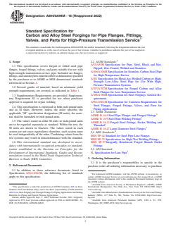 ABSTRACT This specification covers carbon and alloy steel forgings for pipe flanges, fittings, valves, and parts for high-pressure transmission service. A chemical heat analysis of the steel shall be made, and the steel shall conform to specified chemical composition requirements. Materials adhere to testing and tensile property requirements as well. SCOPE 1.1 This specification covers forged or rolled steel pipe flanges, forged fittings, valves, and parts suitable for use with high-strength transmission-service pipe. Included are flanges, fittings, and similar parts ordered either to dimensions specified by the purchaser or to ASME or MSS dimensional standards referenced in Section 2. 1.2 Several grades of material, based on minimum yield strength requirements, are covered, as indicated in Table 1. 1.3 Supplementary Requirements are provided. Supplementary Requirement S1 is provided for use when purchaser approval is required for repair welding. 1.4 This specification is expressed in both inch-pound units and in SI units. However, unless the order specifies the applicable “M” specification designation (SI units), the material shall be furnished to inch-pound units. 1.5 The values stated in either SI units or inch-pound units are to be regarded separately as standard. Within the text, the SI units are shown in brackets. The values stated in each system are not exact equivalents; therefore, each system must be used independently of the other. Combining values from the two systems may result in nonconformance with the standard. 1.6 This international standard was developed in accordance with internationally recognized principles on standardization established in the Decision on Principles for the Development of International Standards, Guides and Recommendations issued by the World Trade Organization Technical Barriers to Trade (TBT) Committee.