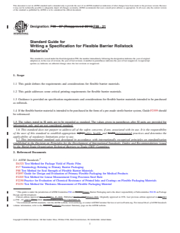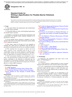 SIGNIFICANCE AND USE 5.1 Flexible barrier materials are universally used across industries and produced by a myriad of suppliers. They may be monolayer materials or complex composite structures. However, even with the diversity of material, there are still basic requirements that all flexible barrier materials should exhibit. 5.2 Flexible barrier material requirements may be divided into two categories, initial material qualification, and routine production and receipt requirements to ensure the purchaser receives exactly what is ordered. While all requirements may be included in the written specification, initial qualification tests may only be needed prior to the first order. Routine production and receipt requirements should be adhered to on every order. Initial qualification requirements are indicated with each clause, where applicable. 5.3 This guide provides an understanding of the requirements needed for the manufacture, purchase, and acceptance of flexible barrier materials. Appropriate test methods for compliance are also cited. Note 1: All test methods for a particular requirement may not be cited due to specific or unique circumstances. For additional guidance on applicable methods, refer to Guide F2097. 5.4 The specification and its requirements should be mutually agreed to by the supplier and purchaser of the product. This helps ensure that the flexible barrier materials will comply with the specified requirements. SCOPE 1.1 This guide defines the requirements and considerations for flexible barrier materials. 1.2 This guide addresses some critical printing requirements for flexible barrier materials. 1.3 Guidance is provided on specification requirements and considerations for flexible barrier materials intended to be purchased as rollstock. 1.4 If the flexible barrier material is intended to be purchased in the form of a pre-made sterile barrier system, Guide F2559 should be referenced. 1.5 The values stated in SI units are to be regarded as standard. The values given in parentheses after SI units are provided for information only and are not considered standard. 1.6 This standard does not purport to address all of the safety concerns, if any, associated with its use. It is the responsibility of the user of this standard to establish appropriate safety, health, and environmental practices and determine the applicability of regulatory limitations prior to use. 1.7 This international standard was developed in accordance with internationally recognized principles on standardization established in the Decision on Principles for the Development of International Standards, Guides and Recommendations issued by the World Trade Organization Technical Barriers to Trade (TBT) Committee.