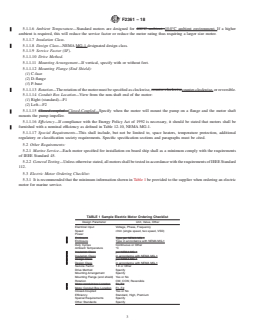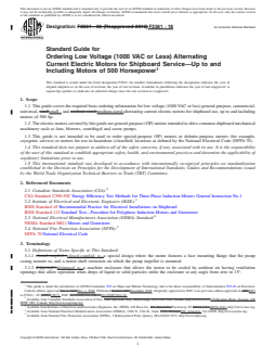 ABSTRACT This guide provides the required basic ordering information for low voltage (1000 VAC or less, and up to and including motors of 500 hp) general-purpose (GP), commercial, universal, small and medium sized alternating current electric motors intended to drive common shipboard mechanical machinery such as fans, blowers, centrifugal and screw pumps. This guide does not address the ordering information for special-purpose (SP) motors, definite-purpose motors (for example, cryogenic service), or motors for use in hazardous (classified) locations as defined by the National Electrical Code (NFPA 70). The ordering checklist shall provide the following minimum information: electrical input; speed; power; enclosure; duty cycles; ambient temperature; insulation class; design class; service factor; drive method; mounting arrangement; mounting flange (end shield); rotation; motor conduit box location; closed-coupled; efficiency; and other special requirements. SIGNIFICANCE AND USE 4.1 The selection criteria is to be applied for uses of (1) new motors and (2) replacement motors. 4.2 For the selection of new or replacement motors, this practice defines the choice criteria in terms of the ordering data below. SCOPE 1.1 This guide covers the required basic ordering information for low voltage (1000 VAC or less) general-purpose, commercial, universal, small-, and medium-sized alternating current electric motors for shipboard use, up to and including motors of 500 hp. 1.2 The electric motors covered by this guide are general-purpose (GP) motors intended to drive common shipboard mechanical machinery such as fans, blowers, centrifugal and screw pumps. 1.3 This guide is not intended to be used to order special-purpose (SP) motors or definite-purpose motors (for example, cryogenic service) or motors for use in hazardous (classified) locations as defined by the National Electrical Code (NFPA 70). 1.4 This standard does not purport to address all of the safety concerns, if any, associated with its use. It is the responsibility of the user of this standard to establish appropriate safety, health, and environmental practices and determine the applicability of regulatory limitations prior to use. 1.5 This international standard was developed in accordance with internationally recognized principles on standardization established in the Decision on Principles for the Development of International Standards, Guides and Recommendations issued by the World Trade Organization Technical Barriers to Trade (TBT) Committee.