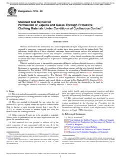 ASTM F739-20 is a standard published by ASTM International. Its full title is "Standard Test Method for Permeation of Liquids and Gases Through Protective Clothing Materials Under Conditions of Continuous Contact". This standard covers: SIGNIFICANCE AND USE 5.1 This test method is normally used to evaluate flat specimens from finished items of protective clothing and from materials that are candidates for items of protective clothing. 5.1.1 Finished items of protective clothing include gloves, sleeves, aprons, suits, coveralls, hoods, boots, respirators, and the like. 5.1.2 The phrase “specimens from finished items” encompasses seamed or other discontinuous regions as well as the usual continuous regions of protective clothing items. 5.1.3 Selected seams for testing are representative of seams used in the principal construction of the protective clothing item and typically include seams of both the base material and where the base material is joined with other types of materials. 5.2 The breakthrough detection time, standardized breakthrough time, permeation rate, and cumulative permeation are key measures of the effectiveness of a clothing material as a barrier to the test chemical. Such information is used in the comparison of clothing materials during the process of selecting clothing for protection from hazardous chemicals. Long breakthrough detection times, long standardized breakthrough detection times, low amounts of cumulative permeation, and low permeation rates are characteristics of more effective barrier materials than materials with higher permeation characteristics. Note 1: At present, only limited quantitative information exists about acceptable levels of dermal contact with most chemicals. Therefore, the data obtained using this test method cannot be used to infer safe exposure levels. 5.2.1 The reporting of a standardized breakthrough time greater than a specific time period means that the test chemical has not permeated the specimen at a rate exceeding 0.1 μg/cm2/min in the designated time. Permeation may or may not have occurred at a lower rate during this time interval. 5.2.2 The reporting of cumulative permeation over a specified test period is another means to report barrier pe... SCOPE 1.1 This test method measures the permeation of liquids and gases through protective clothing materials under the condition of continuous contact. 1.2 This test method is designed for use when the test chemical is a gas or a liquid, where the liquid is either volatile (that is, having a vapor pressure greater than 1 mm Hg at 25 °C) or soluble in water or another liquid that does not interact with the clothing material. 1.3 Values states in SI units are to be regarded as standard. Values given in parentheses are not exact equivalents and are given for information only. 1.4 This standard does not purport to address all of the safety concerns, if any, associated with its use. It is the responsibility of the user of this standard to establish appropriate safety, health, and environmental practices and determine the applicability of regulatory limitations prior to use. Specific precautionary statements are given in Section 7. 1.5 This international standard was developed in accordance with internationally recognized principles on standardization established in the Decision on Principles for the Development of International Standards, Guides and Recommendations issued by the World Trade Organization Technical Barriers to Trade (TBT) Committee.