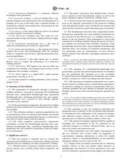 SIGNIFICANCE AND USE 5.1 This test method is normally used to evaluate flat specimens from finished items of protective clothing and from materials that are candidates for items of protective clothing. 5.1.1 Finished items of protective clothing include gloves, sleeves, aprons, suits, coveralls, hoods, boots, respirators, and the like. 5.1.2 The phrase “specimens from finished items” encompasses seamed or other discontinuous regions as well as the usual continuous regions of protective clothing items. 5.1.3 Selected seams for testing are representative of seams used in the principal construction of the protective clothing item and typically include seams of both the base material and where the base material is joined with other types of materials. 5.2 The breakthrough detection time, standardized breakthrough time, permeation rate, and cumulative permeation are key measures of the effectiveness of a clothing material as a barrier to the test chemical. Such information is used in the comparison of clothing materials during the process of selecting clothing for protection from hazardous chemicals. Long breakthrough detection times, long standardized breakthrough detection times, low amounts of cumulative permeation, and low permeation rates are characteristics of more effective barrier materials than materials with higher permeation characteristics. Note 1: At present, only limited quantitative information exists about acceptable levels of dermal contact with most chemicals. Therefore, the data obtained using this test method cannot be used to infer safe exposure levels. 5.2.1 The reporting of a standardized breakthrough time greater than a specific time period means that the test chemical has not permeated the specimen at a rate exceeding 0.1 μg/cm2/min in the designated time. Permeation may or may not have occurred at a lower rate during this time interval. 5.2.2 The reporting of cumulative permeation over a specified test period is another means to report barrier pe... SCOPE 1.1 This test method measures the permeation of liquids and gases through protective clothing materials under the condition of continuous contact. 1.2 This test method is designed for use when the test chemical is a gas or a liquid, where the liquid is either volatile (that is, having a vapor pressure greater than 1 mm Hg at 25 °C) or soluble in water or another liquid that does not interact with the clothing material. 1.3 Values states in SI units are to be regarded as standard. Values given in parentheses are not exact equivalents and are given for information only. 1.4 This standard does not purport to address all of the safety concerns, if any, associated with its use. It is the responsibility of the user of this standard to establish appropriate safety, health, and environmental practices and determine the applicability of regulatory limitations prior to use. Specific precautionary statements are given in Section 7. 1.5 This international standard was developed in accordance with internationally recognized principles on standardization established in the Decision on Principles for the Development of International Standards, Guides and Recommendations issued by the World Trade Organization Technical Barriers to Trade (TBT) Committee.