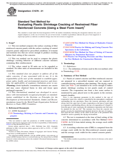 ASTM C1579-21 is a standard published by ASTM International. Its full title is "Standard Test Method for Evaluating Plastic Shrinkage Cracking of Restrained Fiber Reinforced Concrete (Using a Steel Form Insert)". This standard covers: SIGNIFICANCE AND USE 5.1 The test method is intended to evaluate the effects of evaporation, settlement, and early autogenous shrinkage on the plastic shrinkage cracking performance of fiber reinforced concrete up to and for some hours beyond the time of final setting (see Terminology C125). 5.2 The measured values obtained from this test may be used to compare the performance of concretes with different mixture proportions, concretes with and without fibers, concretes containing various amounts of different types of fibers, and concretes containing various amounts and types of admixtures. For meaningful comparisons, the evaporative conditions during test shall be sufficient to produce an average crack width of at least 0.5 mm in the control specimens (2, 3) (see Note 2). In addition, the evaporation rate from a free surface of water shall be within ± 5 % for each test. Note 2: To achieve evaporation rates that result in a crack of at least 0.5 mm in the control specimens, it may be necessary to use an evaporation rate higher than that discussed in Note 1. 5.3 This method attempts to control atmospheric variables to quantify the relative performance of a given fresh concrete mixture. Since many other variables such as cement fineness, aggregate gradation, aggregate volume, mixing procedures, slump, air content, concrete temperature and surface finish can also influence potential cracking, attention shall be paid to keep these as consistent as possible from mixture to mixture. SCOPE 1.1 This test method compares the surface cracking of fiber reinforced concrete panels with the surface cracking of control concrete panels subjected to prescribed conditions of restraint and moisture loss that are severe enough to produce cracking before final setting of the concrete. 1.2 This test method can be used to compare the plastic shrinkage cracking behavior of different concrete mixtures containing fiber reinforcement. 1.3 The values stated in SI units are to be regarded as standard. No other units of measurement are included in this standard. 1.4 This standard does not purport to address all of the safety concerns, if any, associated with its use. It is the responsibility of the user of this standard to establish appropriate safety, health, and environmental practices and determine the applicability of regulatory limitations prior to use. (Warning—fresh hydraulic cementitious mixtures are caustic and may cause chemical burns to skin and tissue upon prolonged exposure.2) 1.5 This international standard was developed in accordance with internationally recognized principles on standardization established in the Decision on Principles for the Development of International Standards, Guides and Recommendations issued by the World Trade Organization Technical Barriers to Trade (TBT) Committee.