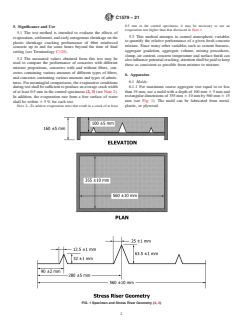 SIGNIFICANCE AND USE 5.1 The test method is intended to evaluate the effects of evaporation, settlement, and early autogenous shrinkage on the plastic shrinkage cracking performance of fiber reinforced concrete up to and for some hours beyond the time of final setting (see Terminology C125). 5.2 The measured values obtained from this test may be used to compare the performance of concretes with different mixture proportions, concretes with and without fibers, concretes containing various amounts of different types of fibers, and concretes containing various amounts and types of admixtures. For meaningful comparisons, the evaporative conditions during test shall be sufficient to produce an average crack width of at least 0.5 mm in the control specimens (2, 3) (see Note 2). In addition, the evaporation rate from a free surface of water shall be within ± 5 % for each test. Note 2: To achieve evaporation rates that result in a crack of at least 0.5 mm in the control specimens, it may be necessary to use an evaporation rate higher than that discussed in Note 1. 5.3 This method attempts to control atmospheric variables to quantify the relative performance of a given fresh concrete mixture. Since many other variables such as cement fineness, aggregate gradation, aggregate volume, mixing procedures, slump, air content, concrete temperature and surface finish can also influence potential cracking, attention shall be paid to keep these as consistent as possible from mixture to mixture. SCOPE 1.1 This test method compares the surface cracking of fiber reinforced concrete panels with the surface cracking of control concrete panels subjected to prescribed conditions of restraint and moisture loss that are severe enough to produce cracking before final setting of the concrete. 1.2 This test method can be used to compare the plastic shrinkage cracking behavior of different concrete mixtures containing fiber reinforcement. 1.3 The values stated in SI units are to be regarded as standard. No other units of measurement are included in this standard. 1.4 This standard does not purport to address all of the safety concerns, if any, associated with its use. It is the responsibility of the user of this standard to establish appropriate safety, health, and environmental practices and determine the applicability of regulatory limitations prior to use. (Warning—fresh hydraulic cementitious mixtures are caustic and may cause chemical burns to skin and tissue upon prolonged exposure.2) 1.5 This international standard was developed in accordance with internationally recognized principles on standardization established in the Decision on Principles for the Development of International Standards, Guides and Recommendations issued by the World Trade Organization Technical Barriers to Trade (TBT) Committee.