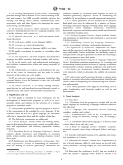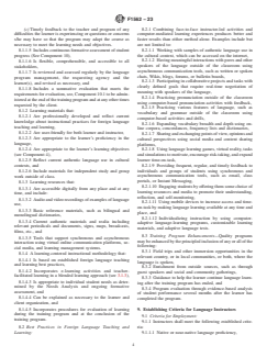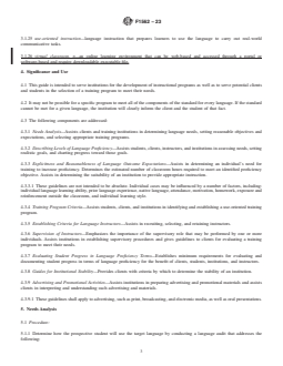 SIGNIFICANCE AND USE 4.1 This guide is intended to serve institutions for the development of instructional programs as well as to serve potential clients and students in the selection of a training program to meet their needs. 4.2 It may not be possible for a specific program to meet all of the components of the standard for every language. If the standard cannot be met for a given language, the institution will clearly inform the client and the student of that fact. 4.3 The following components are addressed: 4.3.1 Needs Analysis—Assists clients and training institutions in determining language needs, setting reasonable objectives and expectations, and selecting appropriate training programs. 4.3.2 Describing Levels of Language Proficiency—Assists students, clients, instructors, and institutions in assessing needs, setting realistic goals, and charting progress toward those goals. 4.3.3 Explicitness and Reasonableness of Language Outcome Expectations—Assists in determining an individual's need for training to increase proficiency. Determines the estimated number of classroom hours required to meet an identified proficiency objective. Assists in determining the suitability of an institution to provide appropriate instruction. 4.3.3.1 These guidelines are not intended to be absolute. Individual cases may be influenced by a number of factors, including: individual language learning ability, prior language experience, native language, attendance, motivation, homework, exposure and reinforcement outside the classroom, and individual learning style. 4.3.4 Training Program Criteria—Assists students, clients, and institutions in identifying and establishing a use-oriented training program. 4.3.5 Establishing Criteria for Language Instructors—Assists in recruiting, selecting, and retaining instructors. 4.3.6 Supervision of Instructors—Emphasizes the importance of the supervisory role that may be performed by one or more individuals. Assists institutions in establishing... SCOPE 1.1 This guide covers identification of the components of a quality language instructional program and establishes criteria for each component. This guide is meant to provide criteria for the minimum standard for a program designed to attain specified language proficiency goals. 1.2 This international standard was developed in accordance with internationally recognized principles on standardization established in the Decision on Principles for the Development of International Standards, Guides and Recommendations issued by the World Trade Organization Technical Barriers to Trade (TBT) Committee.