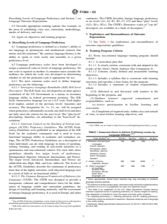ASTM F1562-23 is a guide published by ASTM International. Its full title is "Standard Guide for Use-Oriented Foreign Language Instruction". This standard covers: SIGNIFICANCE AND USE 4.1 This guide is intended to serve institutions for the development of instructional programs as well as to serve potential clients and students in the selection of a training program to meet their needs. 4.2 It may not be possible for a specific program to meet all of the components of the standard for every language. If the standard cannot be met for a given language, the institution will clearly inform the client and the student of that fact. 4.3 The following components are addressed: 4.3.1 Needs Analysis—Assists clients and training institutions in determining language needs, setting reasonable objectives and expectations, and selecting appropriate training programs. 4.3.2 Describing Levels of Language Proficiency—Assists students, clients, instructors, and institutions in assessing needs, setting realistic goals, and charting progress toward those goals. 4.3.3 Explicitness and Reasonableness of Language Outcome Expectations—Assists in determining an individual's need for training to increase proficiency. Determines the estimated number of classroom hours required to meet an identified proficiency objective. Assists in determining the suitability of an institution to provide appropriate instruction. 4.3.3.1 These guidelines are not intended to be absolute. Individual cases may be influenced by a number of factors, including: individual language learning ability, prior language experience, native language, attendance, motivation, homework, exposure and reinforcement outside the classroom, and individual learning style. 4.3.4 Training Program Criteria—Assists students, clients, and institutions in identifying and establishing a use-oriented training program. 4.3.5 Establishing Criteria for Language Instructors—Assists in recruiting, selecting, and retaining instructors. 4.3.6 Supervision of Instructors—Emphasizes the importance of the supervisory role that may be performed by one or more individuals. Assists institutions in establishing... SCOPE 1.1 This guide covers identification of the components of a quality language instructional program and establishes criteria for each component. This guide is meant to provide criteria for the minimum standard for a program designed to attain specified language proficiency goals. 1.2 This international standard was developed in accordance with internationally recognized principles on standardization established in the Decision on Principles for the Development of International Standards, Guides and Recommendations issued by the World Trade Organization Technical Barriers to Trade (TBT) Committee.