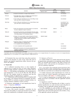 SIGNIFICANCE AND USE 5.1 These practices are suitable for incorporation in a specification. Any reference to material or cushion specification in these practices shall mean any similar agreement between the purchaser and supplier relating to the inspection and acceptance of fabric intended for inflatable restraint use. 5.2 These practices constitute the terminology, conditions, equipment, and procedures by which rolls of inflatable restraint fabrics or cut parts are inspected and graded. 5.3 A specification incorporating these practices may deviate from them to account for considerations of fabric property, material handling equipment, or inflatable restraint cushion design, or a combination thereof. Whenever such deviations from standard occur, they are recorded in the report. 5.4 These practices acknowledge that, in the normal course of production, acceptable rolls of fabric will be produced containing imperfections; subsequently, pieces will be cut from the rolls and those pieces that contain imperfections restricted in Tables 1-5 will be culled at that time. 5.5 The accuracy in the results from visually inspecting fabric using these practices is affected by the ability of the inspector to detect, identify, and evaluate the severity of an imperfection in a moving fabric or in a cut part. Such ability can be affected by visual acuity, viewing distance, fabric traverse speed, lighting conditions, inspector discipline and training, and the availability and accuracy of suitable visual aids. 5.6 Systematic bias may result from using these practices whenever the precision or scale of the visual aids used to identify and quantify imperfections differs between the purchaser and supplier. SCOPE 1.1 These practices cover procedures for the inspection and grading of coated and uncoated woven flat and one-piece woven (OPW) fabrics, and for the inspection and culling of cut parts made of such fabrics, all of which are used in the manufacture of inflatable restraint cushions. 1.2 For ease of reference, the scope, summary of practice, significance and use, apparatus, sampling, procedure, and report sections are listed separately for each inspection practice. Inspection Practice Section Fabric Rolls 7 Cut Pieces & OPW 8 1.3 These practices can be used to distinguish those fabric imperfections that may adversely affect inflatable restraint cushion fabrication or performance from those imperfections that will not. 1.4 Procedures and apparatus other than those stated in these practices may be used by agreement of the purchaser and supplier with the specific deviations from these practices acknowledged in the report. 1.5 The values stated in SI units are to be regarded as the standard. The values given in parentheses are for information only. 1.6 This standard does not purport to address all of the safety concerns, if any, associated with its use. It is the responsibility of the user of this standard to establish appropriate safety, health, and environmental practices and determine the applicability of regulatory limitations prior to use. 1.7 This international standard was developed in accordance with internationally recognized principles on standardization established in the Decision on Principles for the Development of International Standards, Guides and Recommendations issued by the World Trade Organization Technical Barriers to Trade (TBT) Committee.