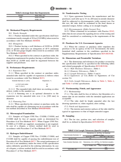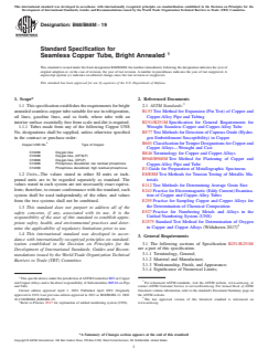 ABSTRACT This specification covers bright annealed seamless copper tube suitable for use in refrigeration,oil lines, gasoline lines, and so forth, where tube with an interior surface essentially free from scale and dirt is required. The material of manufacture shall be billets, cast bars, or tube of the copper UNS No. C10200, C10300, C10800, C12000, or C12200 and shall be of such soundness as to be suitable for processing into the tubular products described. The tube shall be manufactured by such hot- or cold-working process as to produce a homogeneous uniform wrought structure in the finished product. The material shall conform to the required chemical composition specified. The tube shall be furnished in either O50 or O60 annealed tempers. The tube shall have the minimum tensile strength and elongation values as specified when tested. The outside diameter of the tube furnished shall be capable of being expanded to the specified value when tested. The tube shall be capable of being flattened in accordance with the method described. Copper UNS nos. C10200, C12000, and C12200 shall be capable of passing the embrittlement test. Tubes that do not actuate the signaling device of the testing unit shall be considered as conforming to the requirements of the examination. SCOPE 1.1 This specification establishes the requirements for bright annealed seamless copper tube suitable for use in refrigeration, oil lines, gasoline lines, and so forth, where tube with an interior surface essentially free from scale and dirt is required. 1.1.1 Tubes made from any of the following Copper UNS No. designations shall be supplied, unless otherwise specified in the contract or purchase order: Copper UNS No.2 Type of Copper C10200 Oxygen-free C10300 Oxygen-free, (OFXLP) C10800 Oxygen-free, (OFLP) C12000 Phosphorus deoxidized, low residual phosphorus C12200 Phosphorus deoxidized, high residual phosphorus 1.2 Units—The values stated in either SI units or inch-pound units are to be regarded separately as standard. The values stated in each system are not necessarily exact equivalents; therefore, to ensure conformance with the standard, each system shall be used independently of the other, and values from the two systems shall not be combined. 1.3 This standard does not purport to address all of the safety concerns, if any, associated with its use. It is the responsibility of the user of this standard to establish appropriate safety, health, and environmental practices and determine the applicability of regulatory limitations prior to use. 1.4 This international standard was developed in accordance with internationally recognized principles on standardization established in the Decision on Principles for the Development of International Standards, Guides and Recommendations issued by the World Trade Organization Technical Barriers to Trade (TBT) Committee.