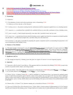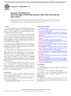 ASTM C882/C882M-23 is a standard published by ASTM International. Its full title is "Standard Test Method for Bond Strength of Bonding Systems Used With Concrete By Slant Shear". This standard covers: ABSTRACT This test method covers the determination of the bond strength of epoxy-resin-base bonding systems for use with Portland-cement concrete. The test method covers bonding hardened concrete to hardened or freshly-mixed concrete. The bond strength is determined by using the epoxy system to bond together two equal sections of Portland-cement mortar cylinder. After suitable curing of the bonding agent, the test is performed by determining the compressive strength of the composite cylinder. Apparatus to mix Portland-cement mortar shall be as described, except for the sections on specimen molds, tamper, and testing machine. The molds shall be constructed in the form of right cylinders. A dummy section shall be machined of a hard material that is not attacked by Portland-cement mortar. The testing machine shall be as described. Laboratory conditions, materials, proportions, and procedures for mixing the Portland-cement mortar shall be tested to meet the requirements specified. SIGNIFICANCE AND USE 5.1 The strength developed by a bonding system that joins two regions of concrete is its most important property. SCOPE 1.1 This test method covers the determination of the bond strength of bonding systems for use with portland-cement concrete. This test method covers bonding hardened concrete to hardened or freshly-mixed concrete. 1.2 The values stated in either SI units or inch-pound units are to be regarded separately as standard. The values stated in each system are not necessarily exact equivalents; therefore, to ensure conformance with the standard, each system shall be used independently of the other, and values from the two systems shall not be combined. 1.3 The text of this standard refers to notes and footnotes that provide explanatory material. These notes and footnotes (excluding those in tables and figures) shall not be considered as requirements of this standard. 1.4 This standard does not purport to address all of the safety concerns, if any, associated with its use. It is the responsibility of the user of this standard to establish appropriate safety, health, and environmental practices and determine the applicability of regulatory limitations prior to use. A specific hazard statement is given in Section 9. (Warning —Fresh hydraulic cementitious mixtures are caustic and may cause chemical burns to exposed skin and tissue upon prolonged exposure.2) 1.5 This international standard was developed in accordance with internationally recognized principles on standardization established in the Decision on Principles for the Development of International Standards, Guides and Recommendations issued by the World Trade Organization Technical Barriers to Trade (TBT) Committee.