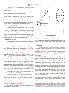 ABSTRACT This test method covers the determination of the bond strength of epoxy-resin-base bonding systems for use with Portland-cement concrete. The test method covers bonding hardened concrete to hardened or freshly-mixed concrete. The bond strength is determined by using the epoxy system to bond together two equal sections of Portland-cement mortar cylinder. After suitable curing of the bonding agent, the test is performed by determining the compressive strength of the composite cylinder. Apparatus to mix Portland-cement mortar shall be as described, except for the sections on specimen molds, tamper, and testing machine. The molds shall be constructed in the form of right cylinders. A dummy section shall be machined of a hard material that is not attacked by Portland-cement mortar. The testing machine shall be as described. Laboratory conditions, materials, proportions, and procedures for mixing the Portland-cement mortar shall be tested to meet the requirements specified. SIGNIFICANCE AND USE 5.1 The strength developed by a bonding system that joins two regions of concrete is its most important property. SCOPE 1.1 This test method covers the determination of the bond strength of bonding systems for use with portland-cement concrete. This test method covers bonding hardened concrete to hardened or freshly-mixed concrete. 1.2 The values stated in either SI units or inch-pound units are to be regarded separately as standard. The values stated in each system are not necessarily exact equivalents; therefore, to ensure conformance with the standard, each system shall be used independently of the other, and values from the two systems shall not be combined. 1.3 The text of this standard refers to notes and footnotes that provide explanatory material. These notes and footnotes (excluding those in tables and figures) shall not be considered as requirements of this standard. 1.4 This standard does not purport to address all of the safety concerns, if any, associated with its use. It is the responsibility of the user of this standard to establish appropriate safety, health, and environmental practices and determine the applicability of regulatory limitations prior to use. A specific hazard statement is given in Section 9. (Warning —Fresh hydraulic cementitious mixtures are caustic and may cause chemical burns to exposed skin and tissue upon prolonged exposure.2) 1.5 This international standard was developed in accordance with internationally recognized principles on standardization established in the Decision on Principles for the Development of International Standards, Guides and Recommendations issued by the World Trade Organization Technical Barriers to Trade (TBT) Committee.