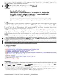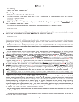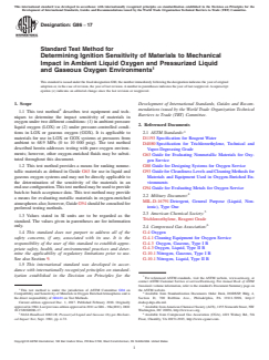 SIGNIFICANCE AND USE 5.1 This test method evaluates the relative sensitivity of materials to mechanical impact in ambient pressure liquid oxygen, pressurized liquid oxygen, and pressurized gaseous oxygen. 5.2 Any change or variation in test sample configuration, thickness, preparation, or cleanliness may cause a significant change in impact sensitivity/reaction threshold. 5.3 Suggested criteria for discontinuing the tests are: (1) occurrence of two reactions in a maximum of 60 samples or less tested at the maximum energy level of 98 J (72 ft•lbf) or one reaction in a maximum of 20 samples tested at any other energy level for a material that fails; (2) no reactions for 20 samples tested at the 98-J (72-ft•lbf) energy level; or (3) a maximum of one reaction in 60 samples tested at the maximum energy level. SCOPE 1.1 This test method2 describes test equipment and techniques to determine the impact sensitivity of materials in oxygen under two different conditions: (1) in ambient pressure liquid oxygen (LOX) or (2) under pressure-controlled conditions in LOX or gaseous oxygen (GOX). It is applicable to materials for use in LOX or GOX systems at pressures from ambient to 68.9 MPa (0 to 10 000 psig). The test method described herein addresses testing with pure oxygen environments; however, other oxygen-enriched fluids may be substituted throughout this document. 1.2 This test method provides a means for ranking nonmetallic materials as defined in Guide G63 for use in liquid and gaseous oxygen systems and may not be directly applicable to the determination of the sensitivity of the materials in an end-use configuration. This test method may be used to provide batch-to batch acceptance data. This test method may provide a means for evaluating metallic materials in oxygen-enriched atmospheres also; however, Guide G94 should be consulted for preferred testing methods. 1.3 Values stated in SI units are to be regarded as the standard. The values given in parentheses are for information only. 1.4 This standard does not purport to address all of the safety concerns, if any, associated with its use. It is the responsibility of the user of this standard to establish appropriate safety, health, and environmental practices and determine the applicability of regulatory limitations prior to use. See also Section 9. 1.5 This international standard was developed in accordance with internationally recognized principles on standardization established in the Decision on Principles for the Development of International Standards, Guides and Recommendations issued by the World Trade Organization Technical Barriers to Trade (TBT) Committee.