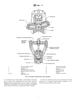 ASTM G86-17 is a standard published by ASTM International. Its full title is "Standard Test Method for Determining Ignition Sensitivity of Materials to Mechanical Impact in Ambient Liquid Oxygen and Pressurized Liquid and Gaseous Oxygen Environments". This standard covers: SIGNIFICANCE AND USE 5.1 This test method evaluates the relative sensitivity of materials to mechanical impact in ambient pressure liquid oxygen, pressurized liquid oxygen, and pressurized gaseous oxygen. 5.2 Any change or variation in test sample configuration, thickness, preparation, or cleanliness may cause a significant change in impact sensitivity/reaction threshold. 5.3 Suggested criteria for discontinuing the tests are: (1) occurrence of two reactions in a maximum of 60 samples or less tested at the maximum energy level of 98 J (72 ft•lbf) or one reaction in a maximum of 20 samples tested at any other energy level for a material that fails; (2) no reactions for 20 samples tested at the 98-J (72-ft•lbf) energy level; or (3) a maximum of one reaction in 60 samples tested at the maximum energy level. SCOPE 1.1 This test method2 describes test equipment and techniques to determine the impact sensitivity of materials in oxygen under two different conditions: (1) in ambient pressure liquid oxygen (LOX) or (2) under pressure-controlled conditions in LOX or gaseous oxygen (GOX). It is applicable to materials for use in LOX or GOX systems at pressures from ambient to 68.9 MPa (0 to 10 000 psig). The test method described herein addresses testing with pure oxygen environments; however, other oxygen-enriched fluids may be substituted throughout this document. 1.2 This test method provides a means for ranking nonmetallic materials as defined in Guide G63 for use in liquid and gaseous oxygen systems and may not be directly applicable to the determination of the sensitivity of the materials in an end-use configuration. This test method may be used to provide batch-to batch acceptance data. This test method may provide a means for evaluating metallic materials in oxygen-enriched atmospheres also; however, Guide G94 should be consulted for preferred testing methods. 1.3 Values stated in SI units are to be regarded as the standard. The values given in parentheses are for information only. 1.4 This standard does not purport to address all of the safety concerns, if any, associated with its use. It is the responsibility of the user of this standard to establish appropriate safety, health, and environmental practices and determine the applicability of regulatory limitations prior to use. See also Section 9. 1.5 This international standard was developed in accordance with internationally recognized principles on standardization established in the Decision on Principles for the Development of International Standards, Guides and Recommendations issued by the World Trade Organization Technical Barriers to Trade (TBT) Committee.