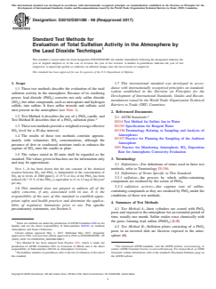 ASTM D2010/D2010M-98(2017) is a standard published by ASTM International. Its full title is "Standard Test Methods for Evaluation of Total Sulfation Activity in the Atmosphere by the Lead Dioxide Technique". This standard covers: SIGNIFICANCE AND USE 5.1 Sulfur oxide gases are produced during the combustion of materials containing sulfur. These gases are precursors of atmospheric sulfuric acid, which has been shown to be injurious to living creatures and plants, as well as some inanimate materials such as metals, limestone and sandstone building materials. 5.2 Sulfur dioxide is moderately toxic and strongly phytotoxic to many species. Permissible ambient levels of SO2 have been established by law. 5.3 When it is necessary to establish whether ambient air concentrations of sulfuric acid precursors, such as sulfur oxides, are present and to comply with legal criteria, manual and automatic monitoring systems specific for the individual sulfur species are used. Likely locations for monitoring sites for the estimation of concentrations and concentration trends over long periods of time can be screened conveniently using the PbO2 candles or sulfation plates. 5.4 Atmospheric corrosion of metallic materials is a function of many weather and atmospheric variables. The effect of specific corrodants, such as SO2, can accelerate the atmospheric corrosion of metals or structures significantly. The PbO2 candle and sulfation plate test methods provide simple techniques to monitor SO2 levels in the atmosphere independently to yield a weighted average result. 5.5 The results of these test methods are useful for characterizing atmospheric corrosion test sites regarding the effective average concentrations of SO2 in the atmosphere at these locations. 5.6 These test methods are useful for determining microclimatic seasonal and long-term variations in effective average SO2 concentrations. 5.7 The results of these test methods may be used in correlations of atmospheric corrosion rates with atmosphere data to determine the sensitivity of the corrosion rate to the SO2 level. 5.8 These test methods may also be used with other test methods to characterize the atmosphere at sites at which buildings or other constructi... SCOPE 1.1 These test methods describe the evaluation of the total sulfation activity in the atmosphere. Because of its oxidizing power, lead dioxide (PbO2) converts not only sulfur dioxide (SO2), but other compounds, such as mercaptans and hydrogen sulfide, into sulfate. It fixes sulfur trioxide and sulfuric acid mist present in the atmosphere (see Note 1). 1.2 Test Method A describes the use of a PbO2 candle, and Test Method B describes that of a PbO2 sulfation plate.2 1.3 These test methods provide a weighted average effective SO2 level for a 30-day interval. 1.4 The results of these test methods correlate approximately with volumetric SO2 concentrations, although the presence of dew or condensed moisture tends to enhance the capture of SO2 onto the candle or plate. 1.5 The values stated in SI units shall be regarded as the standard. The values given in brackets are for information only and may be approximate. Note 1: It has been shown that the rate constant of the chemical reaction between SO2 and PbO2 is independent of the concentration of SO2 up to levels of 1000 ppm(v), if 15 % or less of the PbO2 has been reduced (1).3 15 % of the PbO2 is equivalent to 11 to 12 mg of SO2/cm2 per day. 1.6 This standard does not purport to address all of the safety concerns, if any, associated with its use. It is the responsibility of the user of this standard to establish appropriate safety and health practices and determine the applicability of regulatory limitations prior to use. For specific precautionary statements, see Section 8. 1.7 This international standard was developed in accordance with internationally recognized principles on standardization established in the Decision on Principles for the Development of International Standards, Guides and Recommendations issued by the World Trade Organization Technical Barriers to Trade (TBT) Committee.