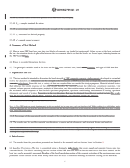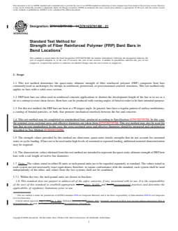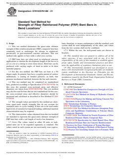 SIGNIFICANCE AND USE 5.1 This test method is intended to determine the bend strength of FRP composite concrete reinforcements, developed at a standard twelve bar diameters of embedment. From this test, a variety of data are acquired that are needed for design purposes. Material-related factors that influence the tensile response of bars include the following: constituent materials, void content, volume percent reinforcement, methods of fabrication, and fiber reinforcement architecture. Similarly, factors relevant to the measured tensile response of bars include specimen preparation, specimen conditioning, environment of testing, specimen alignment, and speed of testing. The results may be used for material specifications, research and development, and structural design and analysis. Note 1: Two FRP bends are tested simultaneously in this test method, but in some cases, only one bend may fail. While resulting in a valid failure, notice should be taken that only one bend has been effectively measured and that the final compiled test results using this method could differ from those resulting from single FRP bend testing. SCOPE 1.1 This test method determines the quasi-static ultimate strength of fiber reinforced polymer (FRP) composite bent bars commonly used as anchorages for stirrups in reinforced, prestressed, or post-tensioned concrete structures. This test method only applies to bars with a solid cross section. 1.2 FRP bent bars are often used in reinforced concrete applications to shorten the development length of the bar or to act as a tie or a stirrup to resist shear forces. Bent bars can be produced with varying angles of bend in order to fit their intended purpose. 1.3 For this test method, the FRP bars are bent at a 90 degree angle. In general, bars have a regular pattern of surface undulations, a coating of bonded particles, or both, that promote mechanical interlock between the bar and concrete. 1.4 This test method may be completed on standardized bars, produced according to Specification D7957/D7957M. In this case, the nominal cross-sectional areas and effective diameters are taken from D7957/D7957M. This test method may also be used for bars that are not standardized. In this case, the cross-sectional areas and effective diameters should be measured and calculated as described in Test Method D7205/D7205M. 1.5 The strength values provided by this method are short-term, quasi-static tensile strengths that do not account for sustained static or cyclic loading. If bars are to be used under high levels of sustained or repeated loading, additional material characterization may be required. 1.6 The characteristic values obtained from this test method are intended to represent the quasi-static ultimate strength of FRP bent bars with a tail length of twelve bar diameters. 1.7 Units—The values stated in either SI units or inch-pound units are to be regarded separately as standard. The values stated in each system are not necessarily exact equivalents; therefore, to ensure conformance with the standard, each system shall be used independently of the other, and values from the two systems shall not be combined. 1.7.1 Within the text, the inch-pound units are shown in brackets. 1.8 This standard does not purport to address all of the safety concerns, if any, associated with its use. It is the responsibility of the user of this standard to establish appropriate safety, health, and environmental practices and determine the applicability of regulatory limitations prior to use. 1.9 This international standard was developed in accordance with internationally recognized principles on standardization established in the Decision on Principles for the Development of International Standards, Guides and Recommendations issued by the World Trade Organization Technical Barriers to Trade (TBT) Committee.
