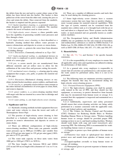 SIGNIFICANCE AND USE 4.1 Hydraulic cleaning methods include equipment that uses water and water velocity to clean the invert and walls of Thermoplastic Sewer Pipe. 4.2 The practice of high-velocity sewer cleaning is best described as a hydraulic cleaning method that uses water pressure to remove obstructions and deposits in sewers or storm drains. 4.3 There are different configurations of high-velocity sewer-cleaning machines. These units can generate variable water pressures up to 5000 psi (34 MPa) and variable flow rates of 50 gal per min (gpm) to 125 gal per min (gpm) (180 L per min to 473 L per min). 4.4 The water tank capacity on these units varies from 1000 gal to 1500 gal (3785 L to 5678 L). 4.5 The hose lengths vary between 500 ft and 1000 ft (152 m and 305 m) in length with a diameter of 3/4 in. to 11/4 in. NPT. 4.6 There are a number of different nozzles and tools that may be used during the cleaning process. 4.7 Some high-velocity sewer cleaners have a vacuum conveyance system that uses large fans or positive displacement vacuum pumps for material removal capabilities. With this type of system, material can be vacuumed from the manhole into a debris tank as it is brought back with the jet or tool and taken to a disposal area. These systems can be either trailer- or truck-mounted and are generally known as combination machines. 4.8 The Occupational Safety and Health Administration (OSHA) has set guidelines for the safe removal of hazardous and nonhazardous substances as stated in OSHA Section 5 of Public Law 91-596; OSHA 29 USC 654; 29 CFR 1910.120; as well as DOT CFR 49 Parts 106–107, 171–180, and 390–397. SCOPE 1.1 This practice covers the personnel requirements, operator training, Environmental Protection Agency (EPA) Guidelines, operating procedures, and recommended equipment performance/design for the proper operation of pressure water-jet cleaning and cutting equipment as normally used by municipalities and contractors concerned with operations, maintenance, and cleaning work of Municipal Thermoplastic gravity sewer pipe. 1.2 The term high-pressure water jetting within this practice covers all water jetting, including the use of jets and hydro mechanical tooling at pressures below 2000 psi (0.69 MPa). 1.3 This practice covers the high-pressure water jetting of Thermoplastic pipe and should not be applied to other pipe and pipe-lining materials without evaluating the recommended cleaning procedure from the pipe manufacturer to avoid damage. 1.4 This practice applies to High-Density Polyethylene, Polypropylene, and Polyvinyl Chloride (HDPE, PP, and PVC) Thermoplastic sewer pipe manufactured in accordance with ASTM Standards. It may also be considered for use for any similar thermoplastic pipe products not covered by this list but with similar performance characteristics. 1.5 The values stated in inch-pound units are to be regarded as standard. The values given in parentheses are mathematical conversions to SI units that are provided for information only and are not considered standard. 1.6 This standard does not purport to address all of the safety concerns, if any, associated with its use. It is the responsibility of the user of this standard to establish appropriate safety, health, and environmental practices and determine the applicability of regulatory limitations prior to use. Some specific hazards statements are given in Section 5 on Hazards/Safety. 1.7 This international standard was developed in accordance with internationally recognized principles on standardization established in the Decision on Principles for the Development of International Standards, Guides and Recommendations issued by the World Trade Organization Technical Barriers to Trade (TBT) Committee.