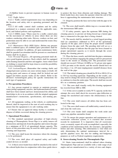 ASTM F3618-22 is a standard published by ASTM International. Its full title is "Standard Practice for Cleaning of Thermoplastic Solid Wall Sanitary Sewer Pipelines". This standard covers: SIGNIFICANCE AND USE 4.1 Hydraulic cleaning methods include equipment that uses water and water velocity to clean the invert and walls of Thermoplastic Sewer Pipe. 4.2 The practice of high-velocity sewer cleaning is best described as a hydraulic cleaning method that uses water pressure to remove obstructions and deposits in sewers or storm drains. 4.3 There are different configurations of high-velocity sewer-cleaning machines. These units can generate variable water pressures up to 5000 psi (34 MPa) and variable flow rates of 50 gal per min (gpm) to 125 gal per min (gpm) (180 L per min to 473 L per min). 4.4 The water tank capacity on these units varies from 1000 gal to 1500 gal (3785 L to 5678 L). 4.5 The hose lengths vary between 500 ft and 1000 ft (152 m and 305 m) in length with a diameter of 3/4 in. to 11/4 in. NPT. 4.6 There are a number of different nozzles and tools that may be used during the cleaning process. 4.7 Some high-velocity sewer cleaners have a vacuum conveyance system that uses large fans or positive displacement vacuum pumps for material removal capabilities. With this type of system, material can be vacuumed from the manhole into a debris tank as it is brought back with the jet or tool and taken to a disposal area. These systems can be either trailer- or truck-mounted and are generally known as combination machines. 4.8 The Occupational Safety and Health Administration (OSHA) has set guidelines for the safe removal of hazardous and nonhazardous substances as stated in OSHA Section 5 of Public Law 91-596; OSHA 29 USC 654; 29 CFR 1910.120; as well as DOT CFR 49 Parts 106–107, 171–180, and 390–397. SCOPE 1.1 This practice covers the personnel requirements, operator training, Environmental Protection Agency (EPA) Guidelines, operating procedures, and recommended equipment performance/design for the proper operation of pressure water-jet cleaning and cutting equipment as normally used by municipalities and contractors concerned with operations, maintenance, and cleaning work of Municipal Thermoplastic gravity sewer pipe. 1.2 The term high-pressure water jetting within this practice covers all water jetting, including the use of jets and hydro mechanical tooling at pressures below 2000 psi (0.69 MPa). 1.3 This practice covers the high-pressure water jetting of Thermoplastic pipe and should not be applied to other pipe and pipe-lining materials without evaluating the recommended cleaning procedure from the pipe manufacturer to avoid damage. 1.4 This practice applies to High-Density Polyethylene, Polypropylene, and Polyvinyl Chloride (HDPE, PP, and PVC) Thermoplastic sewer pipe manufactured in accordance with ASTM Standards. It may also be considered for use for any similar thermoplastic pipe products not covered by this list but with similar performance characteristics. 1.5 The values stated in inch-pound units are to be regarded as standard. The values given in parentheses are mathematical conversions to SI units that are provided for information only and are not considered standard. 1.6 This standard does not purport to address all of the safety concerns, if any, associated with its use. It is the responsibility of the user of this standard to establish appropriate safety, health, and environmental practices and determine the applicability of regulatory limitations prior to use. Some specific hazards statements are given in Section 5 on Hazards/Safety. 1.7 This international standard was developed in accordance with internationally recognized principles on standardization established in the Decision on Principles for the Development of International Standards, Guides and Recommendations issued by the World Trade Organization Technical Barriers to Trade (TBT) Committee.