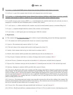 ABSTRACT This specification establishes nationally recognized construction, performance and marking standards for portable emergency fuel containers intended for attended transport of fuel and for one time use by consumers. It identifies the requirements the PEFCs need to meet, as well as the markings that need to be indicated on the containers. It then indicates the test methods that ensure the quality of the containers, including the stability test, the drop test, and the vent test. SCOPE 1.1 This specification establishes nationally recognized construction, performance, and marking standards for portable emergency fuel containers intended for attended transport of fuel and for one time use by consumers. This specification is not for containers intended for unattended storage of fuel. 1.2 This standard does not purport to address all of the safety concerns, if any, associated with its use. It is the responsibility of the user of this standard to establish appropriate safety, health, and environmental practices and determine the applicability of regulatory limitations prior to use. 1.3 This international standard was developed in accordance with internationally recognized principles on standardization established in the Decision on Principles for the Development of International Standards, Guides and Recommendations issued by the World Trade Organization Technical Barriers to Trade (TBT) Committee.