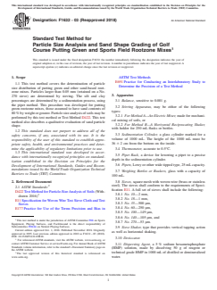 ASTM F1632-03(2018) is a standard test method developed by ASTM International for particle size analysis and sand shape grading in golf course putting green and sports field rootzone mixes. This standard outlines the essential apparatus, standardized procedures, and calculation methods for determining the particle size distribution and qualitative shape grading of sands, specifically for mixes containing at least 80% sand by weight. It enables precise evaluation of materials to support the optimum performance and durability of natural turfgrass playing surfaces.