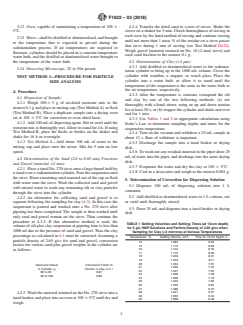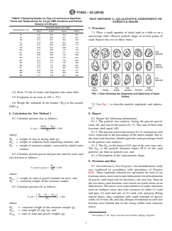 • Apparatus Specifications: Lists all required equipment, including balances, sieves conforming to ASTM E11, sedimentation cylinders, and dispersing agents, ensuring repeatable and standardized results.