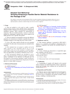 ASTM F2981-15(2020) is a standard published by ASTM International. Its full title is "Standard Test Method for Verifying Nonporous Flexible Barrier Material Resistance to the Passage of Air". This standard covers: SIGNIFICANCE AND USE 3.1 This material challenge is presented in ISO-11607-1 Annex C as a normative test method to demonstrate that a material is nonporous and satisfies the microbial barrier requirements. SCOPE 1.1 This test method is to be used to verify a specific material design property. Some flexible barrier materials are designed to have a resistance to the passage of air through the membrane structure. These materials are characterized as nonporous. This test method provides a means to verify this property by challenging a material with a given volume of air under pressure over a specific time period. 1.2 This test method is not intended to measure the diffusion properties of a material nor to identify or quantify the presence of pinhole damage to the design that may result in leaks. 1.3 Units—The values stated in SI units are to be regarded as standard. No other units of measurement are included in this standard. 1.4 This standard does not purport to address all of the safety concerns, if any, associated with its use. It is the responsibility of the user of this standard to establish appropriate safety, health, and environmental practices and determine the applicability of regulatory limitations prior to use. 1.5 This international standard was developed in accordance with internationally recognized principles on standardization established in the Decision on Principles for the Development of International Standards, Guides and Recommendations issued by the World Trade Organization Technical Barriers to Trade (TBT) Committee.