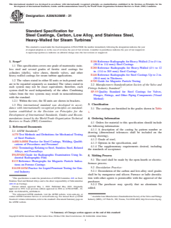 ASTM A356/A356M-21 is a technical specification published by ASTM International. Its full title is "Standard Specification for Steel Castings, Carbon, Low Alloy, and Stainless Steel, Heavy-Walled for Steam Turbines". This standard covers: ABSTRACT This specification covers one grade of martensitic stainless steel and several grades of ferritic steel castings for cylindrical (shells), valve chests, throttle valves, and other heavy-walled castings for steam turbine applications. The steel shall be made by the open-hearth or electric-furnace process. Deoxidation of the carbon and low-alloy steel grades shall be by manganese and silicon. The castings shall be heat treated in either the normalized, tempered, or stress-relieved conditions. Mechanical properties such as tensile strength, yield strength, and elongation shall be determined by subjecting the specimens to a tension test. SCOPE 1.1 This specification covers one grade of martensitic stainless steel and several grades of ferritic steel castings for cylinders (shells), valve chests, throttle valves, and other heavy-walled castings for steam turbine applications. 1.2 The values stated in either SI units or inch-pound units are to be regarded separately as standard. The values stated in each system may not be exact equivalents; therefore, each system shall be used independently of the other. Combining values from the two systems may result in nonconformance with the standard. 1.2.1 Within the text, the SI units are shown in brackets. 1.3 This international standard was developed in accordance with internationally recognized principles on standardization established in the Decision on Principles for the Development of International Standards, Guides and Recommendations issued by the World Trade Organization Technical Barriers to Trade (TBT) Committee.