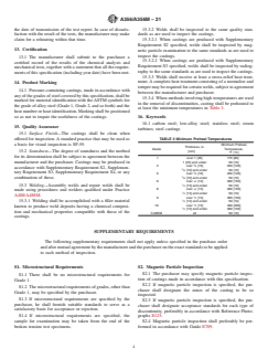 ABSTRACT This specification covers one grade of martensitic stainless steel and several grades of ferritic steel castings for cylindrical (shells), valve chests, throttle valves, and other heavy-walled castings for steam turbine applications. The steel shall be made by the open-hearth or electric-furnace process. Deoxidation of the carbon and low-alloy steel grades shall be by manganese and silicon. The castings shall be heat treated in either the normalized, tempered, or stress-relieved conditions. Mechanical properties such as tensile strength, yield strength, and elongation shall be determined by subjecting the specimens to a tension test. SCOPE 1.1 This specification covers one grade of martensitic stainless steel and several grades of ferritic steel castings for cylinders (shells), valve chests, throttle valves, and other heavy-walled castings for steam turbine applications. 1.2 The values stated in either SI units or inch-pound units are to be regarded separately as standard. The values stated in each system may not be exact equivalents; therefore, each system shall be used independently of the other. Combining values from the two systems may result in nonconformance with the standard. 1.2.1 Within the text, the SI units are shown in brackets. 1.3 This international standard was developed in accordance with internationally recognized principles on standardization established in the Decision on Principles for the Development of International Standards, Guides and Recommendations issued by the World Trade Organization Technical Barriers to Trade (TBT) Committee.