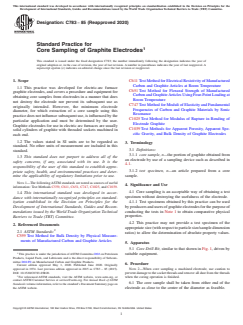 SIGNIFICANCE AND USE 4.1 Core sampling is an acceptable way of obtaining a test specimen without destroying the usefulness of the electrode. 4.1.1 Test specimens obtained by this practice can be used by producers and users of graphite electrodes for the purpose of conducting the tests in Note 1 to obtain comparative physical properties. 4.2 This practice may not provide a test specimen of the appropriate size (with respect to particle size/sample dimension ratios) to allow the determination of absolute property values. SCOPE 1.1 This practice was developed for electric-arc furnace graphite electrodes, and covers a procedure and equipment for obtaining core samples from electrodes in a manner that does not destroy the electrode nor prevent its subsequent use as originally intended. However, the minimum electrode diameter, for which extraction of a core sample using this practice does not influence subsequent use, is influenced by the particular application and must be determined by the user. Graphite electrodes for use in electric arc furnaces are usually solid cylinders of graphite with threaded sockets machined in each end. 1.2 The values stated in SI units are to be regarded as standard. No other units of measurement are included in this standard. 1.3 This standard does not purport to address all of the safety concerns, if any, associated with its use. It is the responsibility of the user of this standard to establish appropriate safety, health, and environmental practices and determine the applicability of regulatory limitations prior to use. Note 1: The following ASTM standards are noted as sources of useful information: Test Methods C559, C611, C651, C747, C1025, and C1039. 1.4 This international standard was developed in accordance with internationally recognized principles on standardization established in the Decision on Principles for the Development of International Standards, Guides and Recommendations issued by the World Trade Organization Technical Barriers to Trade (TBT) Committee.