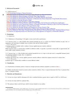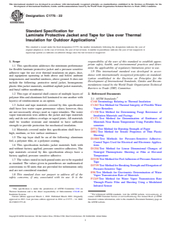 ASTM C1775-22 is a technical specification published by ASTM International. Its full title is "Standard Specification for Laminate Protective Jacket and Tape for Use over Thermal Insulation for Outdoor Applications". This standard covers: SCOPE 1.1 This specification addresses the minimum performance for flexible laminate protective jacket and a pressure sensitive adhesive tape for use over thermal insulation on pipes, duct, and equipment operating at both above and below ambient temperatures and installed outdoors, above ground. It does not include the following: protective metal jacket, homogenous plastic film jacket materials, modified asphalt jacket materials, and butyl rubber membranes. 1.2 This type of material shall consist of multiple layers of polymer film and aluminum foil laminated to one another with layer(s) of reinforcement as an option. 1.3 Jacket and tape materials covered by this specification shall have low water vapor permeance values; however, they are not necessarily always used as vapor retarders. The water vapor transmission tests address the jacket and tape materials only and do not address overlaps or taped joints. All materials shall be weather resistant and intended to have sufficient strength to provide protection for mechanical insulation. 1.4 Materials covered under this specification shall have a high, medium, or low surface emittance. 1.5 The top layer shall be on of the following: aluminum foil, a polymer film, or a polymer coating. 1.6 This specification includes jacket materials both with and without factory applied, pressure sensitive adhesives. The tape materials covered by this specification always have a factory applied, pressure sensitive adhesive. 1.7 The values stated in inch-pound units are to be regarded as standard. The values given in parentheses are mathematical conversions to SI units that are provided for information only and are not considered standard. 1.8 This standard does not purport to address all of the safety concerns, if any, associated with its use. It is the responsibility of the user of this standard to establish appropriate safety, health, and environmental practices and determine the applicability of regulatory limitations prior to use. 1.9 This international standard was developed in accordance with internationally recognized principles on standardization established in the Decision on Principles for the Development of International Standards, Guides and Recommendations issued by the World Trade Organization Technical Barriers to Trade (TBT) Committee.