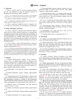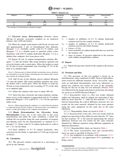 ASTM D7637-10(2021) is a standard published by ASTM International. Its full title is "Standard Test Method for Determination of Glycerin Assay by Titration (Sodium Meta Periodate)". This standard covers: SIGNIFICANCE AND USE 4.1 This test method is based on the cold oxidation of the glycerol by sodium metaperiodate in a strong acidic medium. Formaldehyde and formic acid are produced in this reaction and the latter is used to measure the glycerol content by titration with standard sodium hydroxide solution, to a pH 8.1 ± 0.1. The glycerol content is expressed as a percentage (m/m). 4.2 Interferences—The glycerin sample should be free of organic compounds with more than two hydroxyl groups on adjacent carbon atoms (for example, sugars, glycols). These types of compounds may produce formic acid which interferes with the determination of the glycerol content. SCOPE 1.1 This test method provides the quantitative determination of glycerin by the titrimetric method. It is applicable to all glycerin or glycerin/water mixtures >75 %. 1.2 The values stated in SI units are to be regarded as standard. No other units of measurement are included in this standard. 1.3 This standard may involve hazardous materials, operations, and equipment. This standard does not purport to address all of the safety concerns associated with its use. It is the responsibility of the user of this standard to consult the established and appropriate safety, health, and environmental practices and determine the applicability of regulatory limitations prior to use. Specific precautions are listed in Section 8. 1.4 This international standard was developed in accordance with internationally recognized principles on standardization established in the Decision on Principles for the Development of International Standards, Guides and Recommendations issued by the World Trade Organization Technical Barriers to Trade (TBT) Committee.