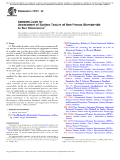 ASTM F2791-24 is a guide published by ASTM International. Its full title is "Standard Guide for Assessment of Surface Texture of Non-Porous Biomaterials in Two Dimensions". This standard covers: SIGNIFICANCE AND USE 4.1 The term “surface texture” is used to describe the local deviations of a surface from an ideal shape. Surface texture usually consists of long wavelength repetitive features that occur as results of chatter, vibration, or heat treatments during the manufacture of implants. Short wavelength features superimposed on the long wavelength features of the surface, which may arise from polishing or etching of the implant, are referred to as roughness. 4.2 This guide provides an overview of techniques that are available for measuring the surface in terms of Cartesian coordinates and the parameters used to describe surface texture. It is important to appreciate that it is not possible to measure surface texture per se, but to derive values for parameters that can be used to describe it. ISO has published a series of standards on surface texture measurements that may be consulted for more information (ISO 3274, ISO 4287, ISO 4288, ISO 5436-2, ISO 10993-19, ISO 12179, ISO 13565-1, ISO 19606, ISO 21920-1, ISO 21920-2, ISO 21920-3, ISO 25178-1, ISO 25178-2, ISO 25178-3, ISO 25178-6, ISO 25178-70, ISO 25178-71, ISO 25178-72, ISO 25178-73, ISO 25178-600, ISO 25178-601, ISO 25178-602, ISO 25178-603, ISO 25178-604, ISO 25178-605, ISO 25178-606, ISO 25178-607, ISO 25178-700, ISO 25178-701). SCOPE 1.1 This guide describes some of the more common methods that are available for measuring the topographical features of a surface and provides an overview of the parameters that are used to quantify them. Being able to reliably derive a set of parameters that describe the texture of biomaterial surfaces is a key aspect in the manufacture of safe and effective implantable medical devices that have the potential to trigger an adverse biological reaction in situ. 1.2 This guide is not intended to apply to porous structures with average pore dimensions in excess of approximately 50 nm (0.05 μm). 1.3 The values stated in SI units are to be regarded as standard. No other units of measurement are included in this standard. 1.4 This standard does not purport to address all of the safety concerns, if any, associated with its use. It is the responsibility of the user of this standard to establish appropriate safety, health, and environmental practices and determine the applicability of regulatory limitations prior to use. 1.5 This international standard was developed in accordance with internationally recognized principles on standardization established in the Decision on Principles for the Development of International Standards, Guides and Recommendations issued by the World Trade Organization Technical Barriers to Trade (TBT) Committee.