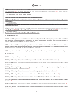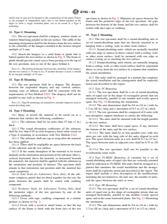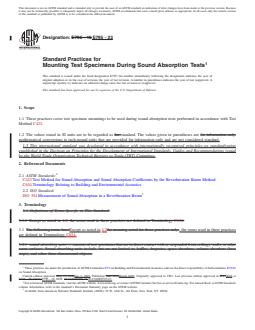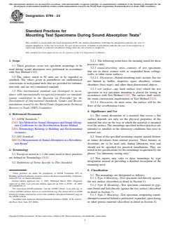 SIGNIFICANCE AND USE 4.1 The sound absorption of a material that covers a flat surface depends not only on the physical properties of the material but also on the way in which the material is mounted over the surface. The mountings specified in these practices are intended to simulate in the laboratory conditions that exist in normal use. 4.2 Some of the specified mountings require special fixtures or minor deviations from normal practice. These fixtures or deviations are to be used only during laboratory tests and should not be specified for practical installations. They are noted in the specifications for the mountings in question by the phrase “for laboratory testing only.” 4.3 Test reports may refer to these mountings by type designation instead of providing a detailed description of the mounting used. SCOPE 1.1 These practices cover test specimen mountings to be used during sound absorption tests performed in accordance with Test Method C423. 1.2 The values stated in SI units are to be regarded as standard. The values given in parentheses are mathematical conversions to inch-pound units that are provided for information only and are not considered standard. 1.3 This international standard was developed in accordance with internationally recognized principles on standardization established in the Decision on Principles for the Development of International Standards, Guides and Recommendations issued by the World Trade Organization Technical Barriers to Trade (TBT) Committee.