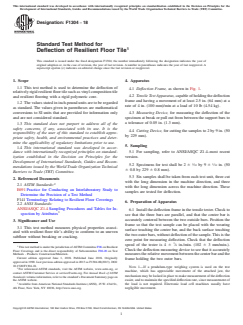 ASTM F1304-18 is a standard published by ASTM International. Its full title is "Standard Test Method for Deflection of Resilient Floor Tile". This standard covers: SIGNIFICANCE AND USE 3.1 This test method measures physical properties associated with resilient floor tile's ability to conform to an uneven subfloor without breaking or cracking. SCOPE 1.1 This test method is used to determine the deflection of relatively rigid resilient floor tile such as vinyl composition tile and resilient flooring with a rigid polymeric core. 1.2 The values stated in inch-pound units are to be regarded as standard. The values given in parentheses are mathematical conversions to SI units that are provided for information only and are not considered standard. 1.3 This standard does not purport to address all of the safety concerns, if any, associated with its use. It is the responsibility of the user of this standard to establish appropriate safety, health, and environmental practices and determine the applicability of regulatory limitations prior to use. 1.4 This international standard was developed in accordance with internationally recognized principles on standardization established in the Decision on Principles for the Development of International Standards, Guides and Recommendations issued by the World Trade Organization Technical Barriers to Trade (TBT) Committee.