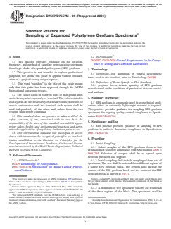 ASTM D7557/D7557M-09(2021) is a standard published by ASTM International. Its full title is "Standard Practice for Sampling of Expanded Polystyrene Geofoam Specimens". This standard covers: SIGNIFICANCE AND USE 5.1 This practice provides guidance on sampling of EPS geofoam in order to determine compliance to Specification D6817/D6817M. SCOPE 1.1 This practice provides guidance on the location, frequency, and method of sampling representative specimens from large blocks of expanded polystyrene (EPS) geofoam. 1.2 This practice is not intended to replace professional judgment, nor should this guide be applied without consideration of a project’s many unique aspects. 1.3 The word “standard” in the title of this guide means only that this guide has been approved through the ASTM International consensus process. 1.4 The values stated in either SI units or inch-pound units are to be regarded separately as standard. The values stated in each system are not necessarily exact equivalents; therefore, to ensure conformance with the standard, each system shall be used independently of the other, and values from the two systems shall not be combined. 1.5 This standard does not purport to address all of the safety concerns, if any, associated with its use. It is the responsibility of the user of this standard to establish appropriate safety, health, and environmental practices and determine the applicability of regulatory limitations prior to use. 1.6 This international standard was developed in accordance with internationally recognized principles on standardization established in the Decision on Principles for the Development of International Standards, Guides and Recommendations issued by the World Trade Organization Technical Barriers to Trade (TBT) Committee.