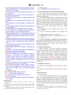ABSTRACT This specification covers alloy steel and stainless steel bolting material for pressure vessels, valves, flanges, and fittings for high temperature or high pressure service, or other special purpose applications. Ferritic steels shall be properly heat treated as best suits the high temperature characteristics of each grade. Immediately after rolling or forging, the bolting material shall be allowed to cool to a temperature below the cooling transformation range. The chemical composition requirements for each alloy are presented in details. The steel shall not contain an unspecified element for ordered grade to the extent that the steel conforms to the requirements of another grade for which that element is a specified element. The tensile property and hardness property requirements are discussed, the tensile property requirement is highlighted by a full size fasteners, wedge tensile testing. SCOPE 1.1 This specification2 covers alloy and stainless steel bolting materials and bolting components for pressure vessels, valves, flanges, and fittings for high temperature or high pressure service, or other special purpose applications. See Specification A962/A962M for the definition of bolting. Bars and wire shall be hot-wrought and may be further processed by centerless grinding or by cold drawing. Austenitic stainless steel may be carbide solution treated or carbide solution treated and strain-hardened. When strain hardened austenitic stainless steel is ordered, the purchaser should take special care to ensure that Appendix X1 is thoroughly understood. 1.2 Several grades are covered, including ferritic steels and austenitic stainless steels designated B5, B8, and so forth. Selection will depend upon design, service conditions, mechanical properties, and high temperature characteristics. 1.3 The following referenced general requirements are indispensable for application of this specification: Specification A962/A962M. Note 1: The committee formulating this specification has included several steel types that have been rather extensively used for the present purpose. Other compositions will be considered for inclusion by the committee from time to time as the need becomes apparent. Note 2: For grades of alloy-steel bolting suitable for use at the lower range of high temperature applications, reference should be made to Specification A354. Note 3: For grades of alloy-steel bolting suitable for use in low temperature applications, reference should be made to Specification A320/A320M. 1.4 Nuts for use with bolting are covered in Section 13. 1.5 Supplementary Requirements are provided for use at the option of the purchaser. The supplementary requirements shall apply only when specified in the purchase order or contract. 1.6 This specification is expressed in both inch-pound units and in SI units; however, unless the purchase order or contract specifies the applicable M specification designation (SI units), the inch-pound units shall apply. 1.7 The values stated in either SI units or inch-pound units are to be regarded separately as standard. Within the text, the SI units are shown in brackets. The values stated in each system may not be exact equivalents; therefore, each system shall be used independently of the other. Combining values from the two systems may result in non-conformance with the standard. 1.8 This international standard was developed in accordance with internationally recognized principles on standardization established in the Decision on Principles for the Development of International Standards, Guides and Recommendations issued by the World Trade Organization Technical Barriers to Trade (TBT) Committee.