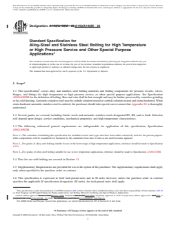 1.1 This specification2 covers alloy and stainless steel bolting materials and bolting components for pressure vessels, valves, flanges, and fittings for high temperature or high pressure service, or other special purpose applications. See Specification A962/A962M for the definition of bolting. Bars and wire shall be hot-wrought and may be further processed by centerless grinding or by cold drawing. Austenitic stainless steel may be carbide solution treated or carbide solution treated and strain-hardened. When strain hardened austenitic stainless steel is ordered, the purchaser should take special care to ensure that Appendix X1 is thoroughly understood.