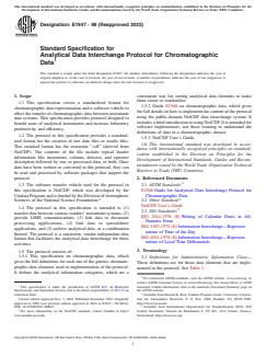 ASTM E1947-98(2022) is a technical specification published by ASTM International. Its full title is "Standard Specification for Analytical Data Interchange Protocol for Chromatographic Data". This standard covers: ABSTRACT This specification covers an analytical data interchange protocol for chromatographic data representation and a software vehicle to affect the transfer of chromatographic data between instrument data systems. This protocol, which is designed to benefit users of analytical instruments and increase laboratory productivity and efficiency, provides a standardized format for the creation of raw data files or results files in the ".cdf" extension. The contents of the file include typical header in formation like instrument, column, detector, and operator description followed by raw or processed data, or both. Once data have been written or converted to this protocol, they can be read and processed by software packages that support the protocol. The end purpose of this protocol is intended to (1) transfer data between various vendors' instrument systems, (2) provide LIMS communications, (3) link data to document processing applications, (4) link data to spreadsheet applications, and ( 5) archive analytical data, or a combination thereof. SCOPE 1.1 This specification covers a standardized format for chromatographic data representation and a software vehicle to effect the transfer of chromatographic data between instrument data systems. This specification provides protocol designed to benefit users of analytical instruments and increase laboratory productivity and efficiency. 1.2 The protocol in this specification provides a standardized format for the creation of raw data files or results files. This standard format has the extension “.cdf” (derived from NetCDF). The contents of the file include typical header information like instrument, column, detector, and operator description followed by raw or processed data, or both. Once data have been written or converted to this protocol, they can be read and processed by software packages that support the protocol. 1.3 The software transfer vehicle used for the protocol in this specification is NetCDF, which was developed by the Unidata Program and is funded by the Division of Atmospheric Sciences of the National Science Foundation.2 1.4 The protocol in this specification is intended to (1) transfer data between various vendors' instrument systems, (2) provide LIMS communications, (3) link data to document processing applications, (4) link data to spreadsheet applications, and (5) archive analytical data, or a combination thereof. The protocol is a consistent, vendor independent data format that facilitates the analytical data interchange for these activities. 1.5 The protocol consists of: 1.5.1 This specification on chromatographic data, which gives the full definitions for each one of the generic chromatographic data elements used in implementation of the protocol. It defines the analytical information categories, which are a convenient way for sorting analytical data elements to make them easier to standardize. 1.5.2 Guide E1948 on chromatographic data, which gives the full details on how to implement the content of the protocol using the public-domain NetCDF data interchange system. It includes a brief introduction to using NetCDF. It is intended for software implementors, not those wanting to understand the definitions of data in a chromatographic dataset. 1.5.3 NetCDF User’s Guide. 1.6 This international standard was developed in accordance with internationally recognized principles on standardization established in the Decision on Principles for the Development of International Standards, Guides and Recommendations issued by the World Trade Organization Technical Barriers to Trade (TBT) Committee.