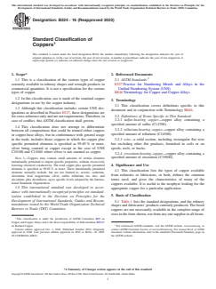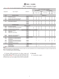 SIGNIFICANCE AND USE 4.1 This classification lists the types of copper available from refineries or fabricators, or both, defines the common terms used, and gives the characteristics of many of the coppers available. It is useful to the neophyte looking for the appropriate copper for a particular application. SCOPE 1.1 This is a classification of the various types of copper currently available in refinery shapes and wrought products in commercial quantities. It is not a specification for the various types of copper. 1.2 In this classification, use is made of the standard copper designations in use by the copper industry. 1.3 Although this classification includes certain UNS designations as described in Practice E527, these designations are for cross-reference only and are not requirements. Therefore, in case of conflict, this ASTM classification shall govern. 1.4 This classification does not attempt to differentiate between all compositions that could be termed either coppers or copper-base alloys, but in conformance with general usage in the trade, includes those coppers in which the copper plus specific permitted elements is specified as 99.85 % or more, silver being counted as copper except in the case of UNS C10100 and C11040 where silver is not counted as copper. Note 1: Coppers may contain small amounts of certain elements intentionally permitted to impart specific properties, without excessively lowering electrical conductivity. The total copper plus specific permitted elements is specified as 99.85 % or more. These intentionally permitted elements normally include, but are not limited to, arsenic, cadmium, chromium, lead, magnesium, silver, sulfur, tellurium, tin, zinc, and zirconium, plus deoxidizers, up to specific levels adopted by the International Standards Organization. 1.5 This international standard was developed in accordance with internationally recognized principles on standardization established in the Decision on Principles for the Development of International Standards, Guides and Recommendations issued by the World Trade Organization Technical Barriers to Trade (TBT) Committee.