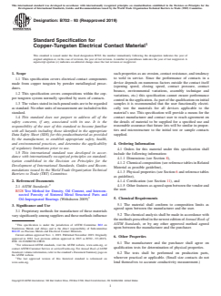 ABSTRACT This specification covers electrical contact components made from copper tungsten by powder metallurgical procedures. The material shall conform to the chemical composition limits as agreed upon between the manufacturer and the user using the newest edition of Annual Book of ASTM standards, or any other approved method agreed upon. Qualification tests for determination of physical properties shall be performed on production parts, wherever practical or applicable. The tests shall be determined after consideration of the function of the part. SCOPE 1.1 This specification covers electrical contact components made from copper tungsten by powder metallurgical procedures. 1.2 This specification covers compositions within the copper tungsten system normally specified by users of contacts. 1.3 The values stated in inch-pound units are to be regarded as standard. No other units of measurement are included in this standard. 1.4 This standard does not purport to address all of the safety concerns, if any, associated with its use. It is the responsibility of the user of this standard to become familiar with all hazards including those identified in the appropriate Data Safety Sheet (SDS) for this product/material as provided by the manufacturer, to establish appropriate safety, health, and environmental practices, and determine the applicability of regulatory limitations prior to use. 1.5 This international standard was developed in accordance with internationally recognized principles on standardization established in the Decision on Principles for the Development of International Standards, Guides and Recommendations issued by the World Trade Organization Technical Barriers to Trade (TBT) Committee.