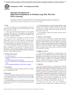 ASTM D7267-19a(2024) is a standard published by ASTM International. Its full title is "Standard Test Method for Edge Ravel Resistance of Finished Loop Pile, Pile Yarn Floor Covering". This standard covers: SIGNIFICANCE AND USE 5.1 The satisfactory performance of a loop pile floor covering depends, to a considerable extent, on the installation and maintenance of the product. A loop pile floor covering with inadequate edge ravel strength may result in loops pulling out from the backing, resulting in an aesthetically displeasing appearance. Tuft rows located at the seam of a loop pile floor covering are the most susceptible to raveling. SCOPE 1.1 This test method covers the determination of the force required to ravel a straight sewn yarn from the edge of a loop pile, textile floor covering. 1.2 The values stated in inch-pound units are to be regarded as standard. The values given in parentheses are mathematical conversions to SI units that are provided for information only and are not considered standard. 1.3 This standard does not purport to address all of the safety concerns, if any, associated with its use. It is the responsibility of the user of this standard to establish appropriate safety, health, and environmental practices and determine the applicability of regulatory limitations prior to use. 1.4 This international standard was developed in accordance with internationally recognized principles on standardization established in the Decision on Principles for the Development of International Standards, Guides and Recommendations issued by the World Trade Organization Technical Barriers to Trade (TBT) Committee.