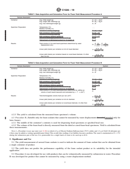 SIGNIFICANCE AND USE 5.1 The yield measurement of aerosol foam sealants is used to indicate the amount of foam sealant that can be obtained from a single container of product. 5.2 The yield does not predict the performance capability of the foam sealant product or its suitability for the intended application. 5.3 Procedure A was developed for use with products that can be volumetrically measured by submersion in water. Procedure B was developed for product that cannot be measured by using a water displacement method. 5.4 Yield is often dependent on the bead size dispensed. Extrapolation of test results using data measured for larger size beads to estimate smaller sized beads has shown inaccuracies. Since yield will be reported based on the diameter of the cured bead (not initial size of wet beads), the operator shall determine the nominal initial bead size required to produce a specific nominal cured bead diameter. This foam characteristic, called “post dispensing contraction” or “post dispensing expansion,” is defined in Terminology C717. SCOPE 1.1 This test method determines the quantity of linear units of a foam sealant at a specified bead diameter that may be obtained from each container of an aerosol product. A minimum of four (4) representative containers of the aerosol product are required for this determination. 1.2 The test method is intended to estimate the contents of the aerosol container (1) for purposes of label statements, and (2) to provide the user information needed to estimate job requirements. 1.3 Foam sealants are used for a variety of end-use applications but are primarily intended to reduce air movement in the building envelope. 1.4 Currently, two main foam sealant types are applicable to this standard: single component polyurethane and latex. 1.5 Values are reported in SI units only. 1.6 This standard does not purport to address all of the safety concerns, if any, associated with its use. It is the responsibility of the user of this standard to establish appropriate safety, health, and environmental practices and determine the applicability of regulatory limitations prior to use. 1.7 This international standard was developed in accordance with internationally recognized principles on standardization established in the Decision on Principles for the Development of International Standards, Guides and Recommendations issued by the World Trade Organization Technical Barriers to Trade (TBT) Committee.