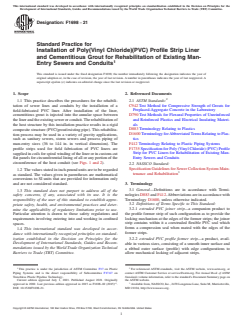 ASTM F1698-21 - Standard Practice for Installation of Poly(Vinyl Chloride)(PVC) Profile Strip Liner and Cementitious Grout for Rehabilitation of Existing Man-Entry Sewers and Conduits
