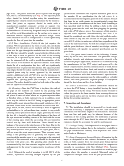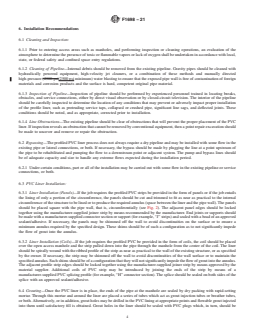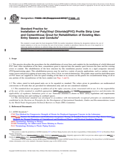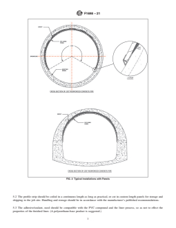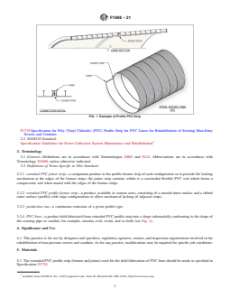 SIGNIFICANCE AND USE 4.1 This practice is for use by designers and specifiers, regulatory agencies, owners, and inspection organizations involved in the rehabilitation of non-pressure sewers and conduits. As for any practice, modifications may be required for specific job conditions. SCOPE 1.1 This practice describes the procedures for the rehabilitation of sewer lines and conduits by the installation of a field-fabricated PVC liner. After installation of the liner, cementitious grout is injected into the annular space between the liner and the existing sewer or conduit. The rehabilitation of the host structure by this installation practice results in a rigid composite structure (PVC/grout/existing pipe). This rehabilitation process may be used in a variety of gravity applications, such as sanitary sewers, storm sewers and process piping of man-entry sizes (36 to 144 in. in vertical dimension). The profile strips used for field fabrication of PVC liners are supplied in coils for spiral winding of the liner or in custom-cut flat panels for circumferential lining of all or any portion of the circumference of the host conduit (see Figs. 1 and 2). FIG. 1 Example of Profile PVC Strip FIG. 2 Typical Installations with Panels 1.2 The values stated in inch-pound units are to be regarded as standard. The values given in parentheses are mathematical conversions to SI units that are provided for information only and are not considered standard. 1.3 This standard does not purport to address all of the safety concerns, if any, associated with its use. It is the responsibility of the user of this standard to establish appropriate safety, health, and environmental practices and determine the applicability of regulatory limitations prior to use. Particular attention is drawn to those safety regulations and requirements involving entering into and working in confined spaces. 1.4 This international standard was developed in accordance with internationally recognized principles on standardization established in the Decision on Principles for the Development of International Standards, Guides and Recommendations issued by the World Trade Organization Technical Barriers to Trade (TBT) Committee.