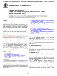 ASTM D5103-07(2018), titled Standard Test Method for Length and Length Distribution of Manufactured Staple Fibers (Single-Fiber Test), provides a standardized procedure for measuring the average length and length distribution of manufactured and natural staple fibers through a manual, single-fiber test. Developed by ASTM International, this test method is essential for textile research, product development, quality control, and acceptance testing of fiber shipments. The standard ensures that measurements are consistent and objective, supporting reliable data for industry stakeholders.