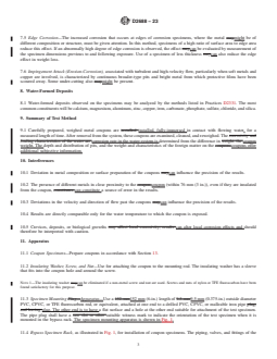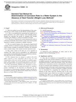 ASTM D2688-23 is a standard published by ASTM International. Its full title is "Standard Test Method for Determination of Corrosion Rate in a Water System in the Absence of Heat Transfer (Weight Loss Method)". This standard covers: SIGNIFICANCE AND USE 4.1 Since the two tendencies are inseparable for a metal to corrode and for water and the materials it contains to promote or inhibit corrosion, the corrosion rate of a material in water is determined in relative, rather than absolute, terms. The relative tendency for a material to corrode is determined by measuring its rate of corrosion and comparing it with the corrosion rates of other materials in the same water environment. Conversely, the relative tendency of water to promote or inhibit corrosion can be determined by comparing the corrosion rate of a material in the water with the corrosion rates of the same material in other waters. Such tests are useful, for example, for evaluating the effects of corrosion inhibitors added to the water. Examples of systems in which this method can be used include, but are not limited to, open recirculating cooling water, closed chilled water, and hydronic heating systems. SCOPE 1.1 This test method covers the determination of the corrosion rate in a water system, in the absence of heat transfer. 1.1.1 This is accomplished by measuring the weight loss of metal specimens, also called coupons, and evaluating pitting. Weight loss provides the means to calculate the average corrosion rate. Pitting is a form of localized corrosion. 1.1.2 The rate of corrosion of a metal immersed in water is a function of both the characteristics of the water itself and the materials it contains to promote or inhibit corrosion. 1.2 The test method employs flat, rectangular-shaped metal coupons which are mounted on pipe plugs and exposed to the water flowing in piping in municipal, building, and industrial water systems using a side stream corrosion specimen rack. 1.3 The values stated in SI units are to be regarded as standard. The values given in parentheses are mathematical conversions to inch-pound units that are provided for information only and are not considered standard. 1.4 This standard does not purport to address all of the safety concerns, if any, associated with its use. It is the responsibility of the user of this standard to establish appropriate safety, health, and environmental practices and determine the applicability of regulatory limitations prior to use. 1.5 This international standard was developed in accordance with internationally recognized principles on standardization established in the Decision on Principles for the Development of International Standards, Guides and Recommendations issued by the World Trade Organization Technical Barriers to Trade (TBT) Committee.