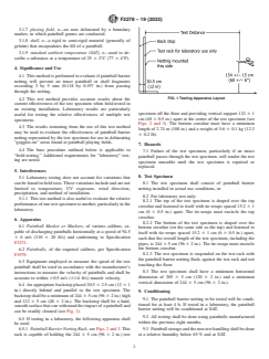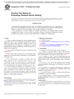 ASTM F2278-19(2023) is a standard published by ASTM International. Its full title is "Standard Test Method for Evaluating Paintball Barrier Netting". This standard covers: SIGNIFICANCE AND USE 4.1 This method is performed to evaluate if paintball barrier netting will prevent an intact paintball or shell fragments exceeding 3 by 5 mm (0.118 by 0.197 in.) from passing through the netting. 4.2 This test method provides accurate results about the current effectiveness of the test specimen when field-tested in an existing installation. Laboratory results are particularly useful for testing the relative effectiveness of multiple test specimens. 4.3 The results stemming from the use of this test method may be used to evaluate the effectiveness of paintball barrier netting represented by the test specimen for use in delineating “goggles-on” areas found at paintball playing fields. 4.4 The base procedure outlined below is applicable to “field-testing.” Additional requirements for “laboratory” testing are noted. SCOPE 1.1 This test method is designed to evaluate paintball barrier netting that may be used to delineate playing fields, chronograph areas, target ranges, and other “goggle-on” areas of an active paintball site. An apparatus is suggested to evaluate paintball barrier netting in a laboratory. On site testing does not require such an apparatus. 1.2 This standard is designed to be used in conjunction with Guide F2184. 1.3 The values stated in SI units are to be regarded as the standard; the inch-pound units in parentheses are provided for information only. 1.4 This standard does not purport to address all of the safety concerns, if any, associated with its use. It is the responsibility of the user of this standard to establish appropriate safety, health, and environmental practices and determine the applicability of regulatory limitations prior to use. 1.5 This international standard was developed in accordance with internationally recognized principles on standardization established in the Decision on Principles for the Development of International Standards, Guides and Recommendations issued by the World Trade Organization Technical Barriers to Trade (TBT) Committee.