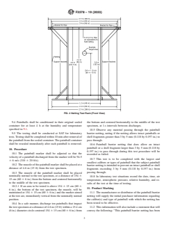 SIGNIFICANCE AND USE 4.1 This method is performed to evaluate if paintball barrier netting will prevent an intact paintball or shell fragments exceeding 3 by 5 mm (0.118 by 0.197 in.) from passing through the netting. 4.2 This test method provides accurate results about the current effectiveness of the test specimen when field-tested in an existing installation. Laboratory results are particularly useful for testing the relative effectiveness of multiple test specimens. 4.3 The results stemming from the use of this test method may be used to evaluate the effectiveness of paintball barrier netting represented by the test specimen for use in delineating “goggles-on” areas found at paintball playing fields. 4.4 The base procedure outlined below is applicable to “field-testing.” Additional requirements for “laboratory” testing are noted. SCOPE 1.1 This test method is designed to evaluate paintball barrier netting that may be used to delineate playing fields, chronograph areas, target ranges, and other “goggle-on” areas of an active paintball site. An apparatus is suggested to evaluate paintball barrier netting in a laboratory. On site testing does not require such an apparatus. 1.2 This standard is designed to be used in conjunction with Guide F2184. 1.3 The values stated in SI units are to be regarded as the standard; the inch-pound units in parentheses are provided for information only. 1.4 This standard does not purport to address all of the safety concerns, if any, associated with its use. It is the responsibility of the user of this standard to establish appropriate safety, health, and environmental practices and determine the applicability of regulatory limitations prior to use. 1.5 This international standard was developed in accordance with internationally recognized principles on standardization established in the Decision on Principles for the Development of International Standards, Guides and Recommendations issued by the World Trade Organization Technical Barriers to Trade (TBT) Committee.