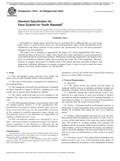 ASTM F910-04(2023) is a technical specification published by ASTM International. Its full title is "Standard Specification for Face Guards for Youth Baseball". This standard covers: ABSTRACT This specification covers protective face guards designed to be attached to a pre-existing helmet for youth baseball. General requirements for protective face guards shall include mechanical strength, durability, flexibility, finish, padding, attachment system, and shall not cause skin irritation. The face guard shall undergo velocity and impact testing using apparatus such as headform and mounting, ball propelling device, and gage. SCOPE 1.1 This specification covers protective face guards for sports such as youth baseball (batters and baserunners). 1.2 This type of face guard is designed to be attached to a pre-existing helmet. 1.3 The equipment covered by this specification is intended to reduce hazards of injury to the face, including eyes and mouth, due to impacts from baseballs or softballs. 1.4 The values stated in SI units are to be regarded as the standard. The values given in parentheses are for information only. 1.5 The following precautionary caveat pertains only to the test method portion, Section 5, of this specification: This standard does not purport to address all of the safety concerns, if any, associated with its use. It is the responsibility of the user of this standard to establish appropriate safety, health, and environmental practices and determine the applicability of regulatory limitations prior to use. 1.6 This international standard was developed in accordance with internationally recognized principles on standardization established in the Decision on Principles for the Development of International Standards, Guides and Recommendations issued by the World Trade Organization Technical Barriers to Trade (TBT) Committee.
