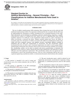 ASTM F3572-22 is a standard published by ASTM International. Its full title is "Standard Practice for Additive Manufacturing – General Principles – Part Classifications for Additive Manufactured Parts Used in Aviation". This standard covers: SCOPE 1.1 This practice is intended to be used to assign part classifications across the aviation industries that use AM to produce parts. 1.2 This practice is applicable to all AM technologies defined in ISO/ASTM 52900 used in aviation. 1.3 This practice is intended to be used to establish a metric for AM parts in downstream documents. 1.4 This practice is not intended to establish criteria for any downstream processes, but rather to establish a metric that these processes can use. 1.5 The part classification metric could be utilized by the engineering, procurement, non-destructive inspection, testing, qualification, or certification processes used for AM aviation parts. 1.6 The classification scheme in this practice establishes a consistent methodology to define and communicate the consequence of failure associated with AM aviation parts. 1.7 This practice is not intended to supersede the requirements and definitions of the applicable regulations or policies, including but not limited to the ones listed in Annex A1. 1.8 Tables A1.1-A1.3 align the existing regulations and guidance with the four part classes established herein. However, this alignment should not be construed as an alignment of the existing regulations to each other. 1.9 The material or process, or both, in general does not affect the consequence of failure of a part, therefore the classification scheme defined in this document may be used outside AM. 1.10 The user of this standard should not assume regulators’ endorsement of this standard as accepted mean of compliance. 1.11 This standard does not purport to address all of the safety concerns, if any, associated with its use. It is the responsibility of the user of this standard to establish appropriate safety, health, and environmental practices and determine the applicability of regulatory limitations prior to use. 1.12 This international standard was developed in accordance with internationally recognized principles on standardization established in the Decision on Principles for the Development of International Standards, Guides and Recommendations issued by the World Trade Organization Technical Barriers to Trade (TBT) Committee.