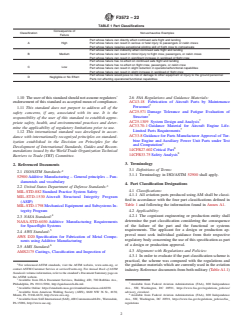 SCOPE 1.1 This practice is intended to be used to assign part classifications across the aviation industries that use AM to produce parts. 1.2 This practice is applicable to all AM technologies defined in ISO/ASTM 52900 used in aviation. 1.3 This practice is intended to be used to establish a metric for AM parts in downstream documents. 1.4 This practice is not intended to establish criteria for any downstream processes, but rather to establish a metric that these processes can use. 1.5 The part classification metric could be utilized by the engineering, procurement, non-destructive inspection, testing, qualification, or certification processes used for AM aviation parts. 1.6 The classification scheme in this practice establishes a consistent methodology to define and communicate the consequence of failure associated with AM aviation parts. 1.7 This practice is not intended to supersede the requirements and definitions of the applicable regulations or policies, including but not limited to the ones listed in Annex A1. 1.8 Tables A1.1-A1.3 align the existing regulations and guidance with the four part classes established herein. However, this alignment should not be construed as an alignment of the existing regulations to each other. 1.9 The material or process, or both, in general does not affect the consequence of failure of a part, therefore the classification scheme defined in this document may be used outside AM. 1.10 The user of this standard should not assume regulators’ endorsement of this standard as accepted mean of compliance. 1.11 This standard does not purport to address all of the safety concerns, if any, associated with its use. It is the responsibility of the user of this standard to establish appropriate safety, health, and environmental practices and determine the applicability of regulatory limitations prior to use. 1.12 This international standard was developed in accordance with internationally recognized principles on standardization established in the Decision on Principles for the Development of International Standards, Guides and Recommendations issued by the World Trade Organization Technical Barriers to Trade (TBT) Committee.
